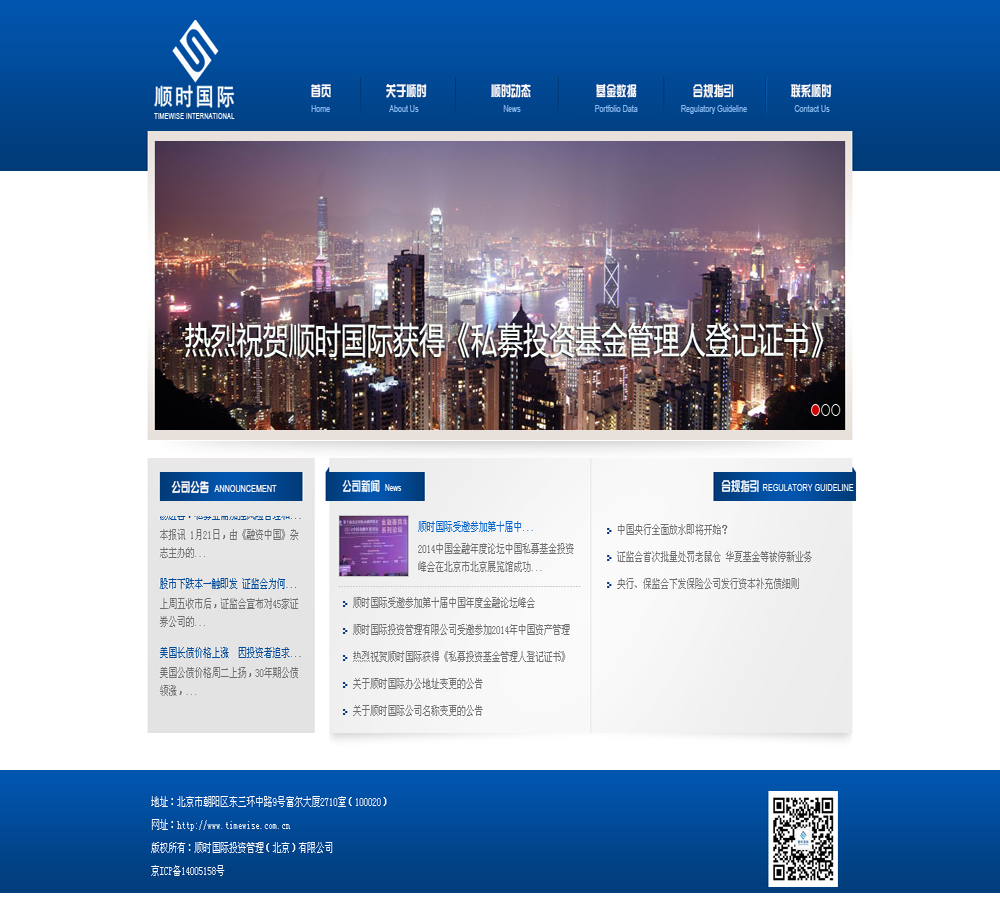 順時國際投資管理(北京)有限公司由一批來自國內證券、期貨、保險、咨詢領域的業內精英聯合創立,是獲得中國證券投資基金業協會頒發私募投資基金牌照的公司(資格編號:P1001220 )。